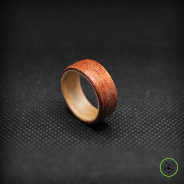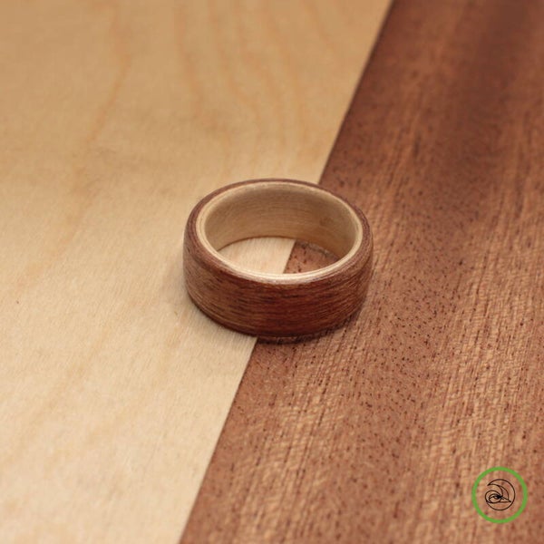 Houten ring uit twee fineer soorten: Esdoorn en Sipo (diepe kleur)